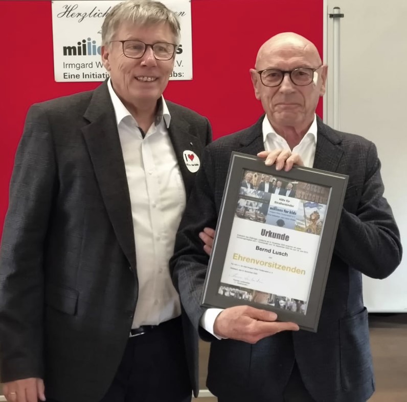 Georg Benz vom Förderverein des Lions Club Gengenbach betonte, dass das Garagenprojekt eine wunderschöne Einrichtung ist, die es wert ist, fortgeführt zu werden. Mit einem Spendenscheck in Höhe von 2500 Euro erfreute er den Vorstand von millions for kids. Vom Lions Club Gengenbach zählten auch der leider verstorbene Emil Zöller und Bernd Lusch zu den Gründungsmitgliedern von millions for kids. Aufgrund seiner 13jährige Vorstandstätigkeit wurde Bernd Lusch von Thomas Laubenstein zum Ehrenvorsitzenden ernannt.